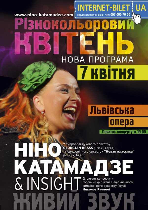 Ніно Катамадзе & INSIGHT з симфонічним оркестром состоится 7 апреля 2014, 19:00, понедельник в Львовский оперный театр им. С. Крушельницкой. С помощью сервиса internet-bilet.ua, Вы сможете с легкостью забронировать, заказать и купить билеты на интересующий Вас концерт, спектакль, оперу, балет, мастер-классы, спортивные и детские мероприятия, оплатив их самым удобным для Вас способом: через интернет банковской картой VISA/MasterCard, наличными или курьером, если сделаете заказ билета c доставкой.