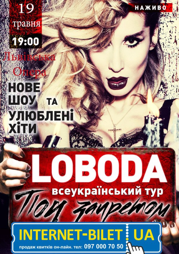 LOBODA "Под запретом" состоится 10 июня 2014, 19:00, вторник в Львовский оперный театр им. С. Крушельницкой. С помощью сервиса internet-bilet.ua, Вы сможете с легкостью забронировать, заказать и купить билеты на интересующий Вас концерт, спектакль, оперу, балет, мастер-классы, спортивные и детские мероприятия, оплатив их самым удобным для Вас способом: через интернет банковской картой VISA/MasterCard, наличными или курьером, если сделаете заказ билета c доставкой.