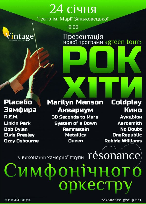 Рок Хіти «green tour» состоится 24 января 2015, 19:00, суббота в Национальный драматический театр им. Марии Заньковецкой. С помощью сервиса internet-bilet.ua, Вы сможете с легкостью забронировать, заказать и купить билеты на интересующий Вас концерт, спектакль, оперу, балет, мастер-классы, спортивные и детские мероприятия, оплатив их самым удобным для Вас способом: через интернет банковской картой VISA/MasterCard, наличными или курьером, если сделаете заказ билета c доставкой.