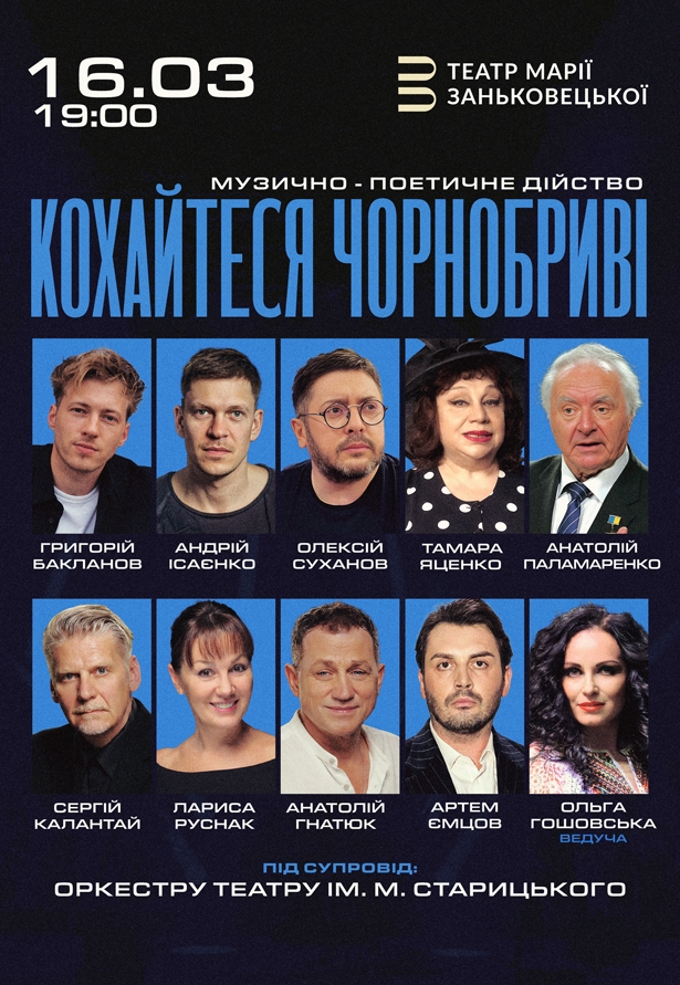 Кохайтеся Чорнобриві - музыкально-поэтическое действо состоится 16 марта 2026, 19:00, понедельник в Национальный драматический театр им. Марии Заньковецкой. С помощью сервиса internet-bilet.ua, Вы сможете с легкостью забронировать, заказать и купить билеты на интересующий Вас концерт, спектакль, оперу, балет, мастер-классы, спортивные и детские мероприятия, оплатив их самым удобным для Вас способом: через интернет банковской картой VISA/MasterCard, наличными или курьером, если сделаете заказ билета c доставкой.
