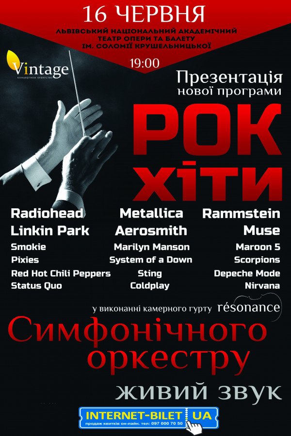 Рок Хіти состоится 16 июня 2014, 19:00, понедельник в Львовский оперный театр им. С. Крушельницкой. С помощью сервиса internet-bilet.ua, Вы сможете с легкостью забронировать, заказать и купить билеты на интересующий Вас концерт, спектакль, оперу, балет, мастер-классы, спортивные и детские мероприятия, оплатив их самым удобным для Вас способом: через интернет банковской картой VISA/MasterCard, наличными или курьером, если сделаете заказ билета c доставкой.