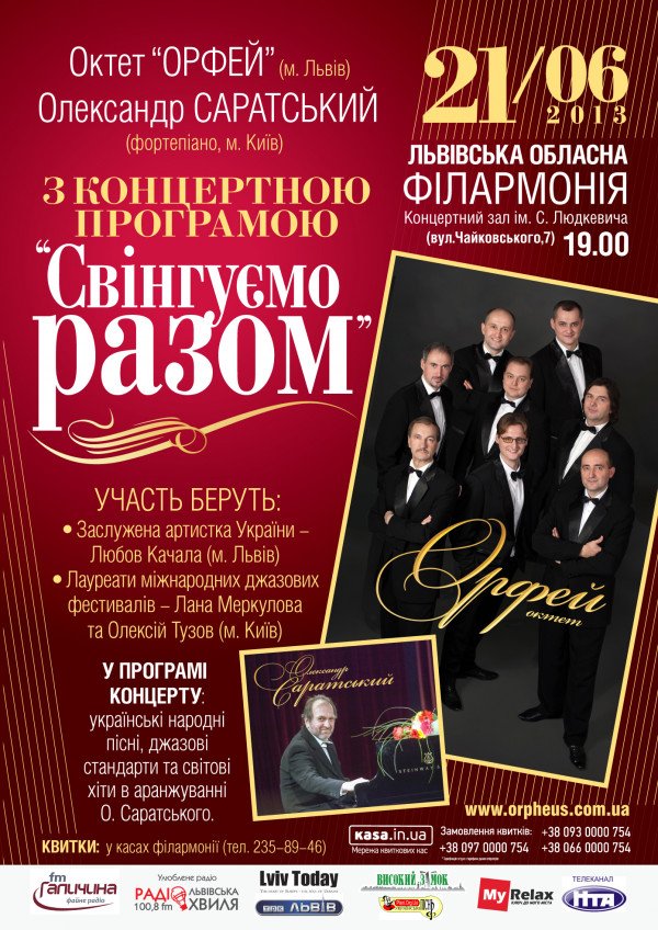 Відомий львівський акапельний чоловічий колектив «Орфей» і знаний київський композитор та джазовий піаніст Олександр Саратський пропонують меломанам спільну концертну програму під назвою «Свінгуємо разом». 21 червня у концертному залі Львівської філармонії артисти обіцяють незабутній вечір джазу, фолку і світових хітів. Початок о 19:00 год, інформують організатори заходу.