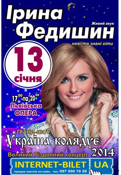 Ірина Федишин. Україна колядує відбудеться 13 січня 2014, 17:00, понеділок в Львівський оперний театр ім. С. Крушельницької. За допомогою сервісу internet-bilet.ua, Ви зможете з легкістю забронювати, замовити та купити квитки на концерт, спектакль, оперу, балет, майстер-класи, спортивні та дитячі заходи, що Вас цікавлять, оплативши їх найбільш зручним для Вас способом: через інтернет банківською карткою VISA/MasterCard, готівкою або кур'єром, якщо зробите замовлення квитка з доставкою.