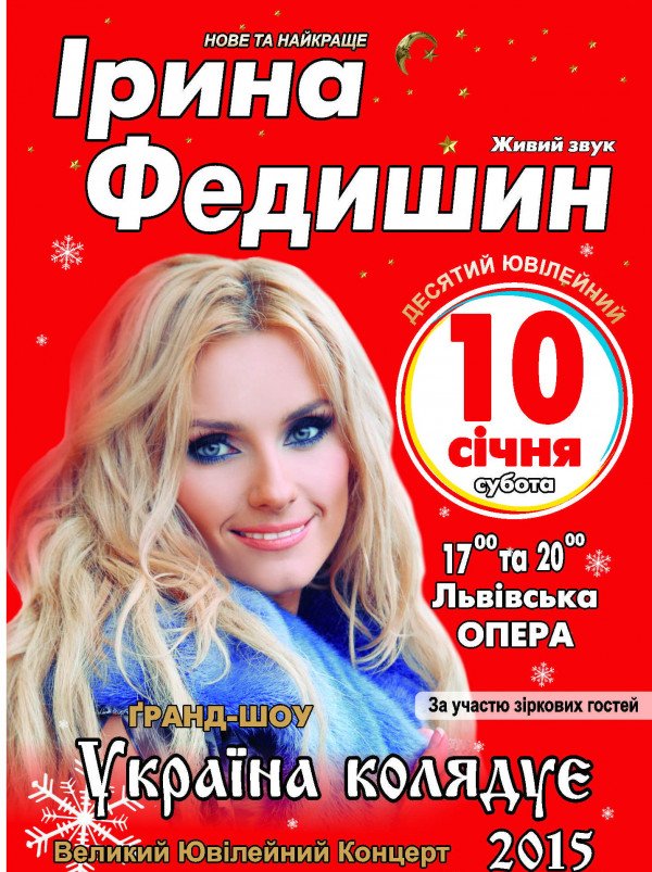 10 січня у Львівському оперному театрі імені Соломії Крушельницької відбудеться два ювілейних концерти Ірини Федишин, які вдесяте подарують глядачам ніжні українські мелодії та святкові різдвяні дійства. Початок о 17:00 та 20:00.