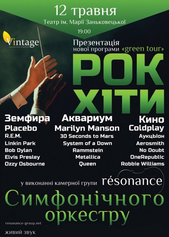 Рок Хіти «green tour» відбудеться 12 травня 2015, 19:00, вівторок в Національний драматичний театр ім. Марії Заньковецької. За допомогою сервісу internet-bilet.ua, Ви зможете з легкістю забронювати, замовити та купити квитки на концерт, спектакль, оперу, балет, майстер-класи, спортивні та дитячі заходи, що Вас цікавлять, оплативши їх найбільш зручним для Вас способом: через інтернет банківською карткою VISA/MasterCard, готівкою або кур'єром, якщо зробите замовлення квитка з доставкою.