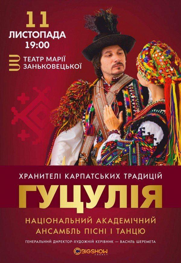 Ансамбль пісні і танцю "Гуцулія" відбудеться 11 листопада 2025, 19:00, вівторок в Національний драматичний театр ім. Марії Заньковецької. За допомогою сервісу internet-bilet.ua, Ви зможете з легкістю забронювати, замовити та купити квитки на концерт, спектакль, оперу, балет, майстер-класи, спортивні та дитячі заходи, що Вас цікавлять, оплативши їх найбільш зручним для Вас способом: через інтернет банківською карткою VISA/MasterCard, готівкою або кур'єром, якщо зробите замовлення квитка з доставкою.
