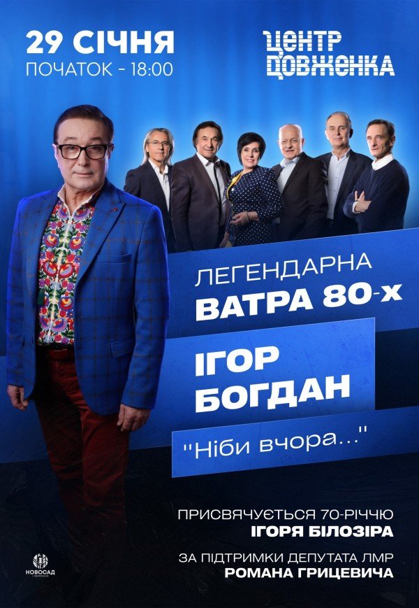 Ігор Богдан і Ватра 80-х відбудеться 29 січня 2026, 18:00, четвер в Центр Довженка. За допомогою сервісу internet-bilet.ua, Ви зможете з легкістю забронювати, замовити та купити квитки на концерт, спектакль, оперу, балет, майстер-класи, спортивні та дитячі заходи, що Вас цікавлять, оплативши їх найбільш зручним для Вас способом: через інтернет банківською карткою VISA/MasterCard, готівкою або кур'єром, якщо зробите замовлення квитка з доставкою.