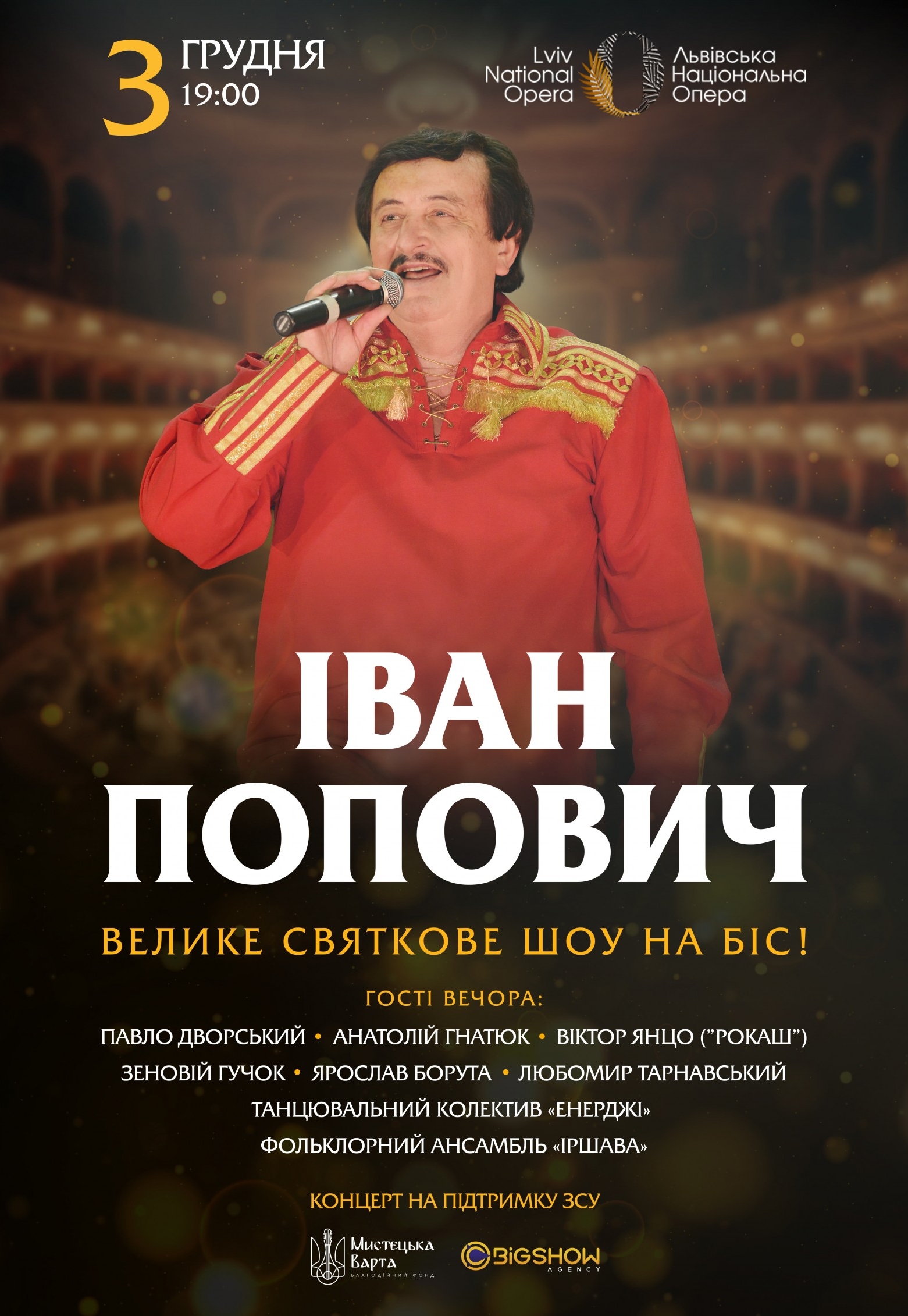 Іван Попович. Велике ювілейне шоу на біс! відбудеться 3 грудня 2025, 19:00, середа в Львівський національний академічний театр опери та балету ім. С. Крушельницької. За допомогою сервісу internet-bilet.ua, Ви зможете з легкістю забронювати, замовити та купити квитки на концерт, спектакль, оперу, балет, майстер-класи, спортивні та дитячі заходи, що Вас цікавлять, оплативши їх найбільш зручним для Вас способом: через інтернет банківською карткою VISA/MasterCard, готівкою або кур'єром, якщо зробите замовлення квитка з доставкою.